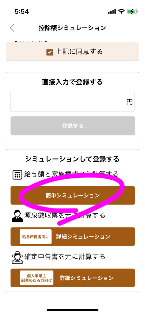 なんか同意して「簡単シミュレーション」と進み、自分の年収と